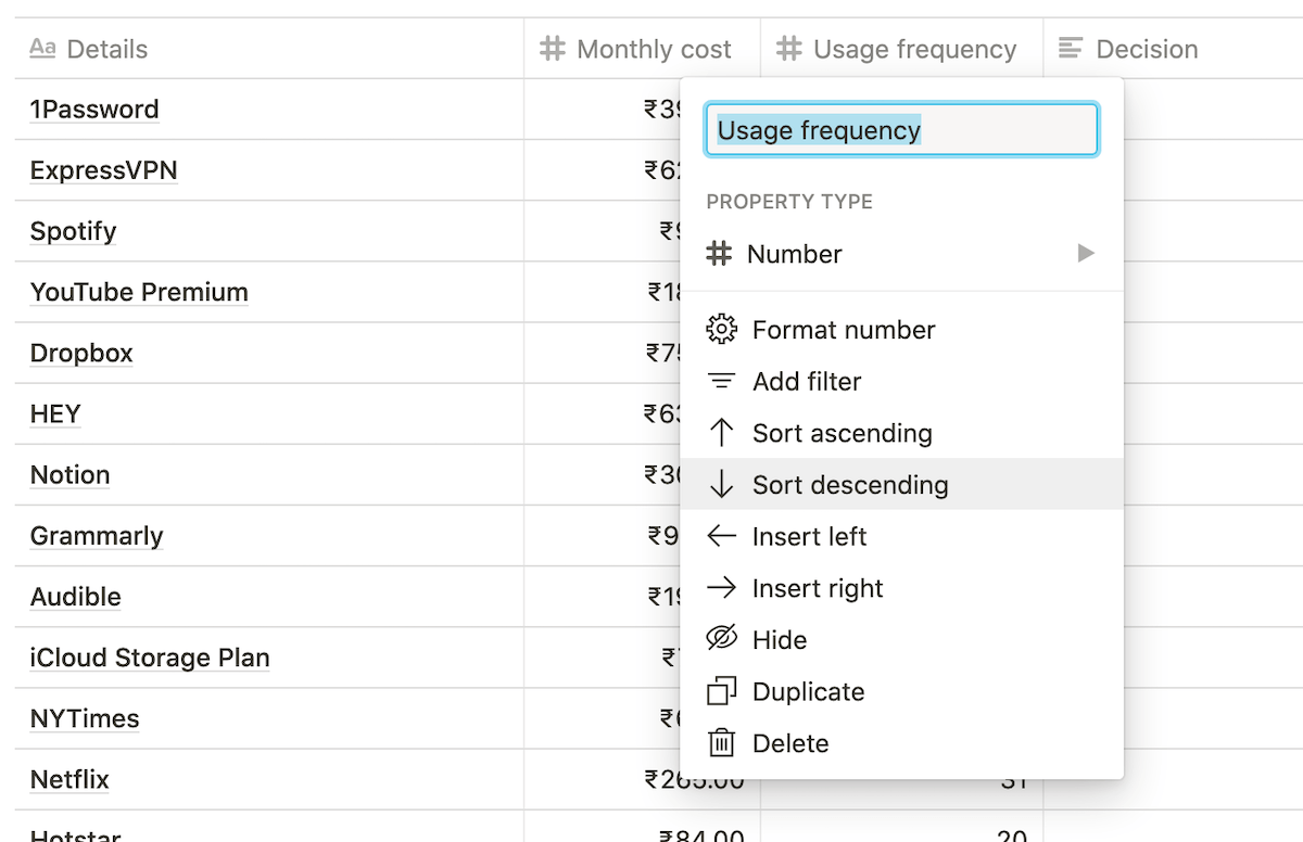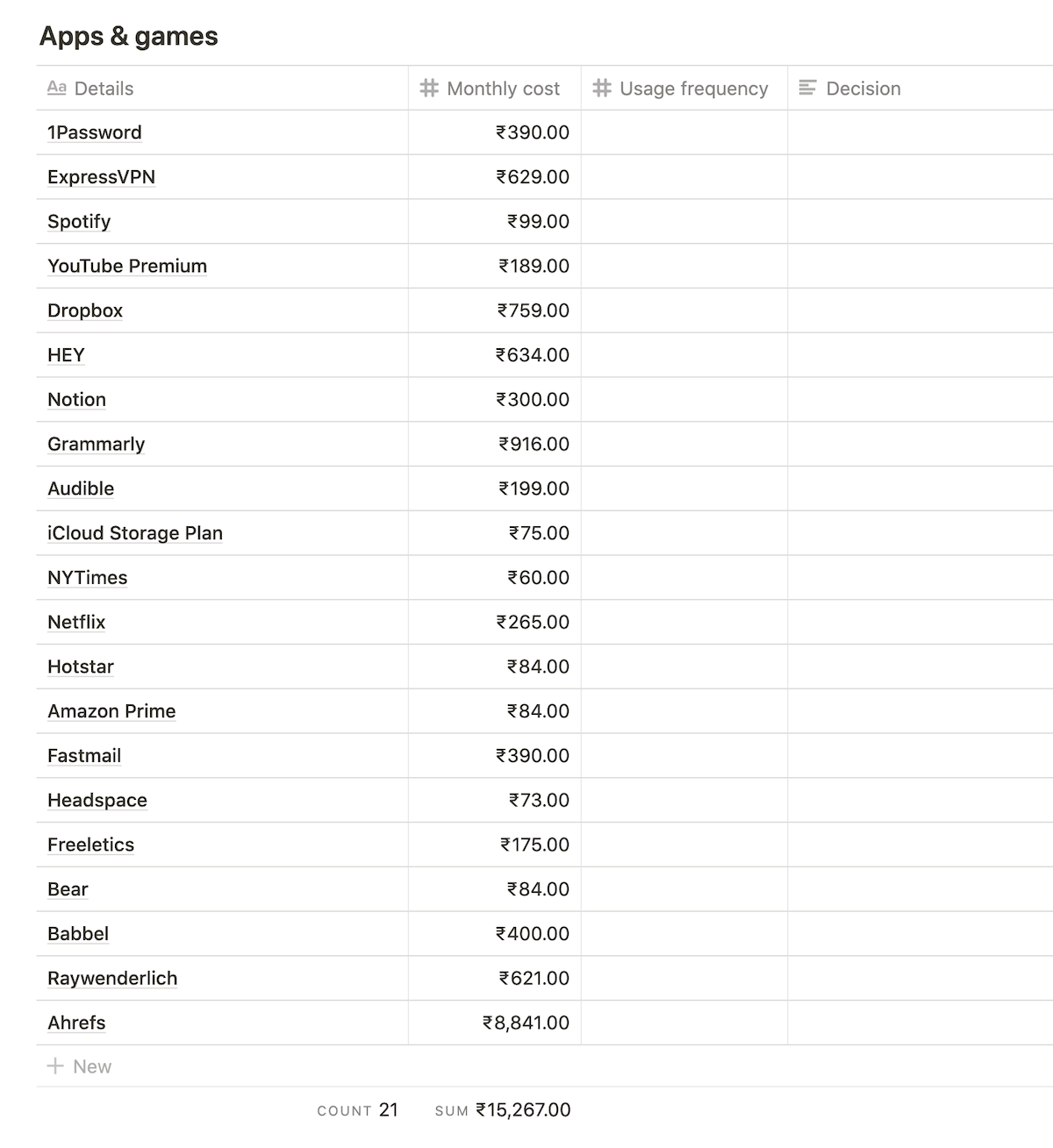Following the above process, I listed down my active subscriptions from these areas onto my Notion page.