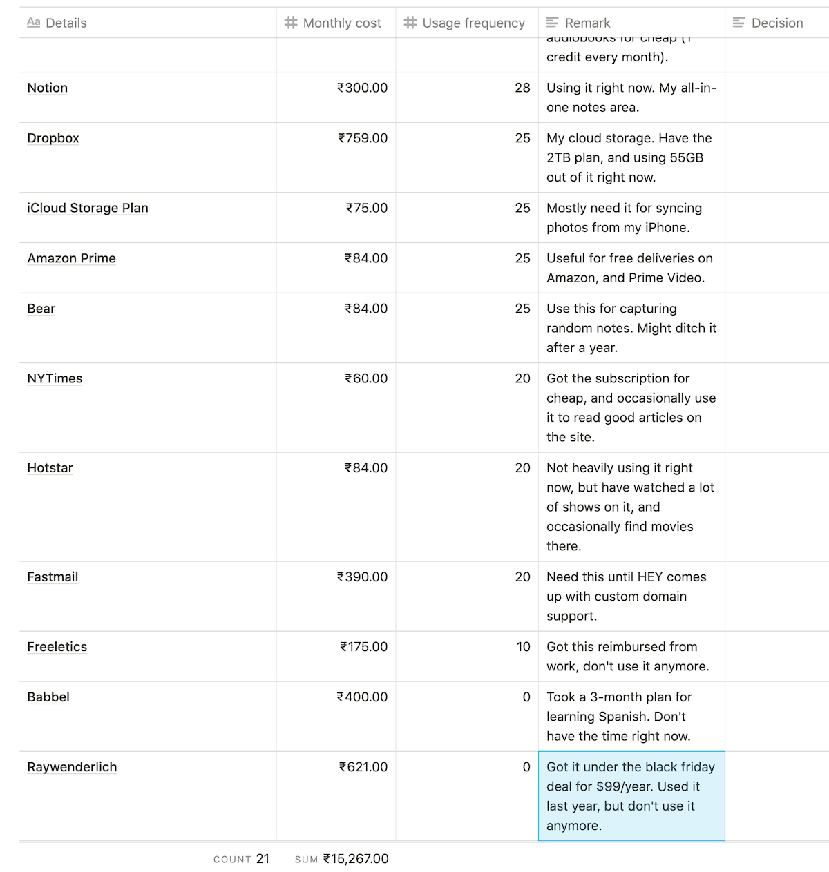 I created a new column called “Remark”, and added a 1–2 line note about why I got the subscription, and how do I use it.