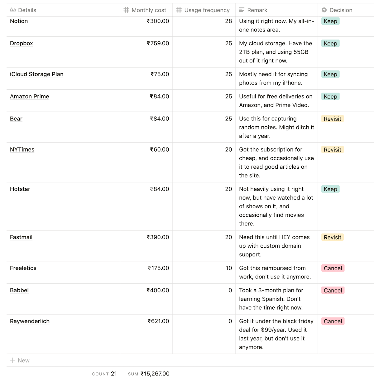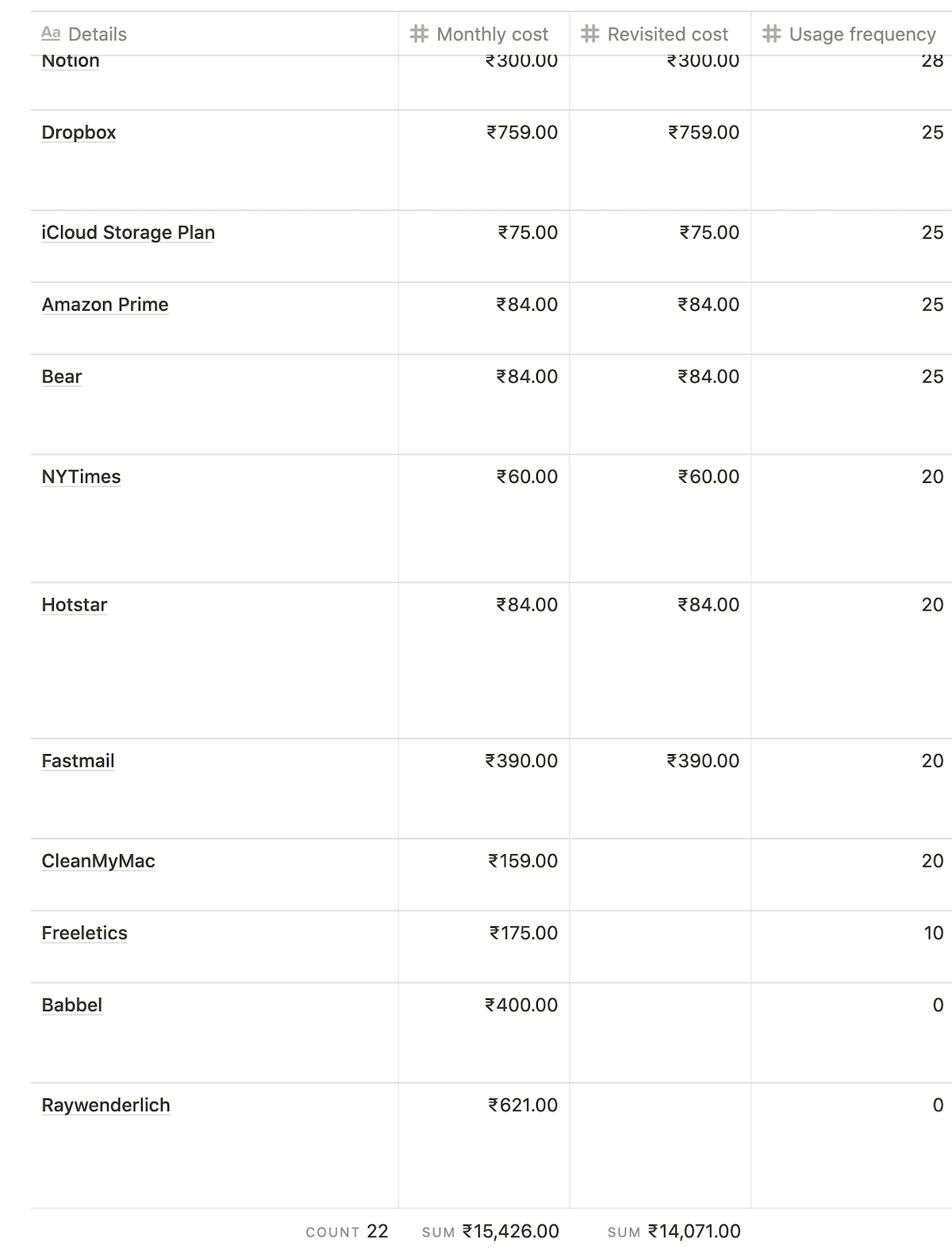 Noting down my usage frequency gave me a clearer picture of how much an app or a service is useful to me rather than giving them an abstract rating.