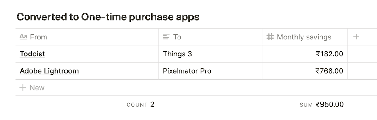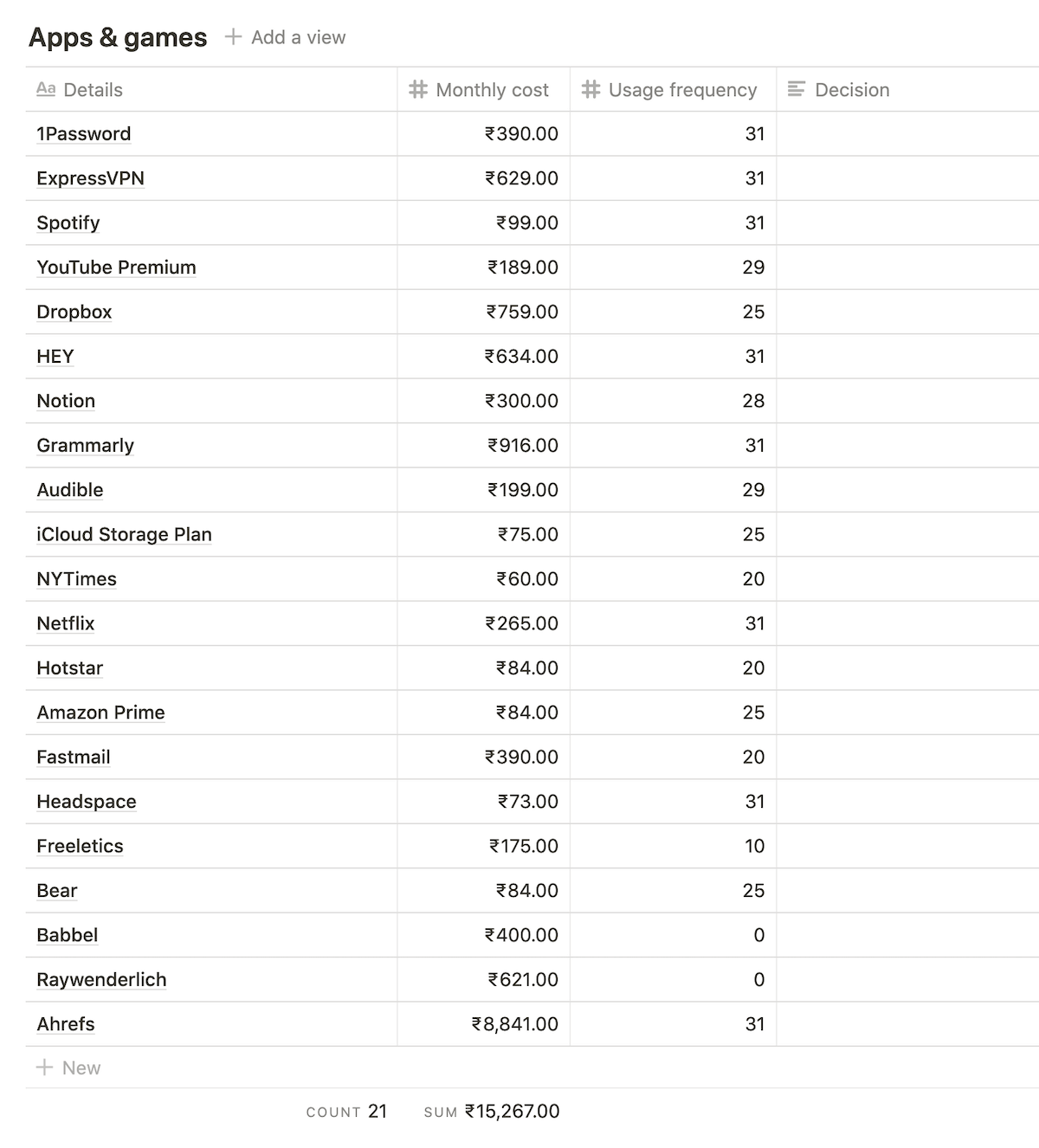 I use Notion heavily as my knowledge base, so I made a new page to list down all of my active subscriptions with their monthly cost.