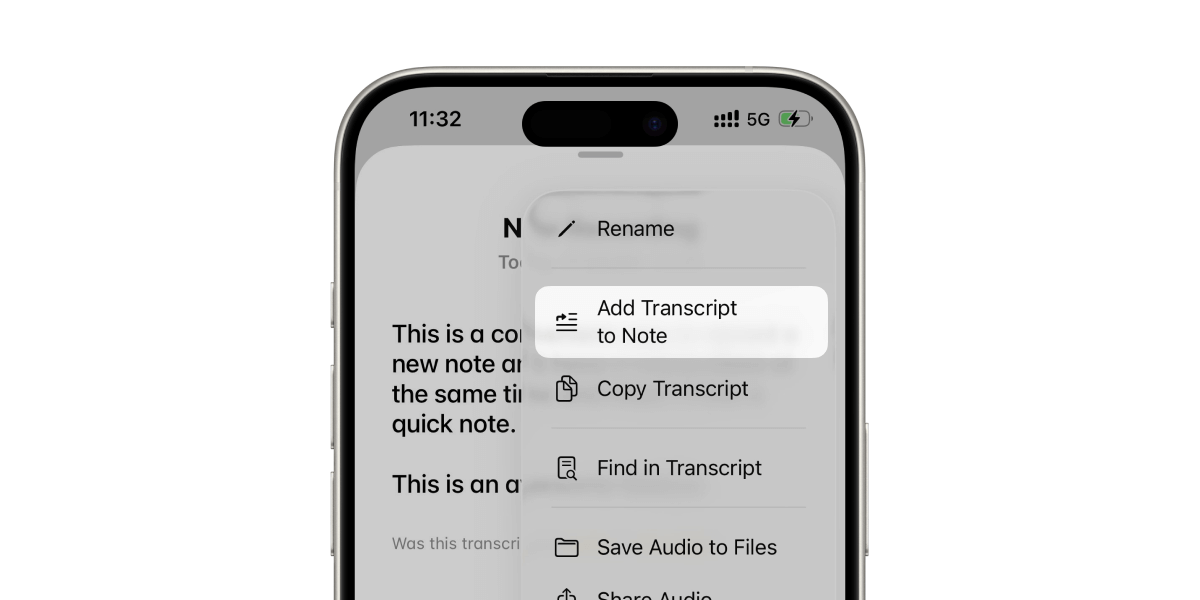 If you want to work with the transcript to make adjustments or expand on the captured thoughts, you can tap on the three-dots menu and choose Add Transcript to Note: