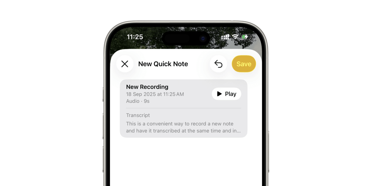 A side-benefit of this approach is that the Notes app automatically transcribes your voice message, which you can refer to at any time by tapping on the inserted voice note block: