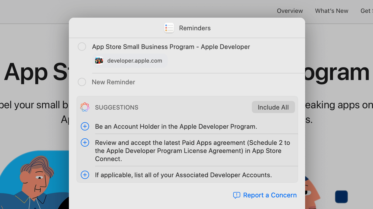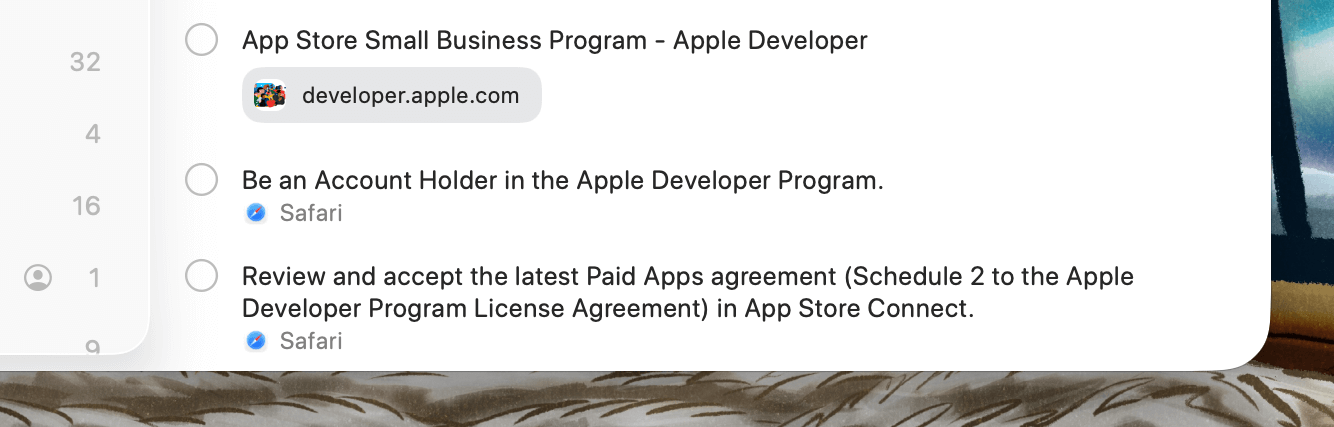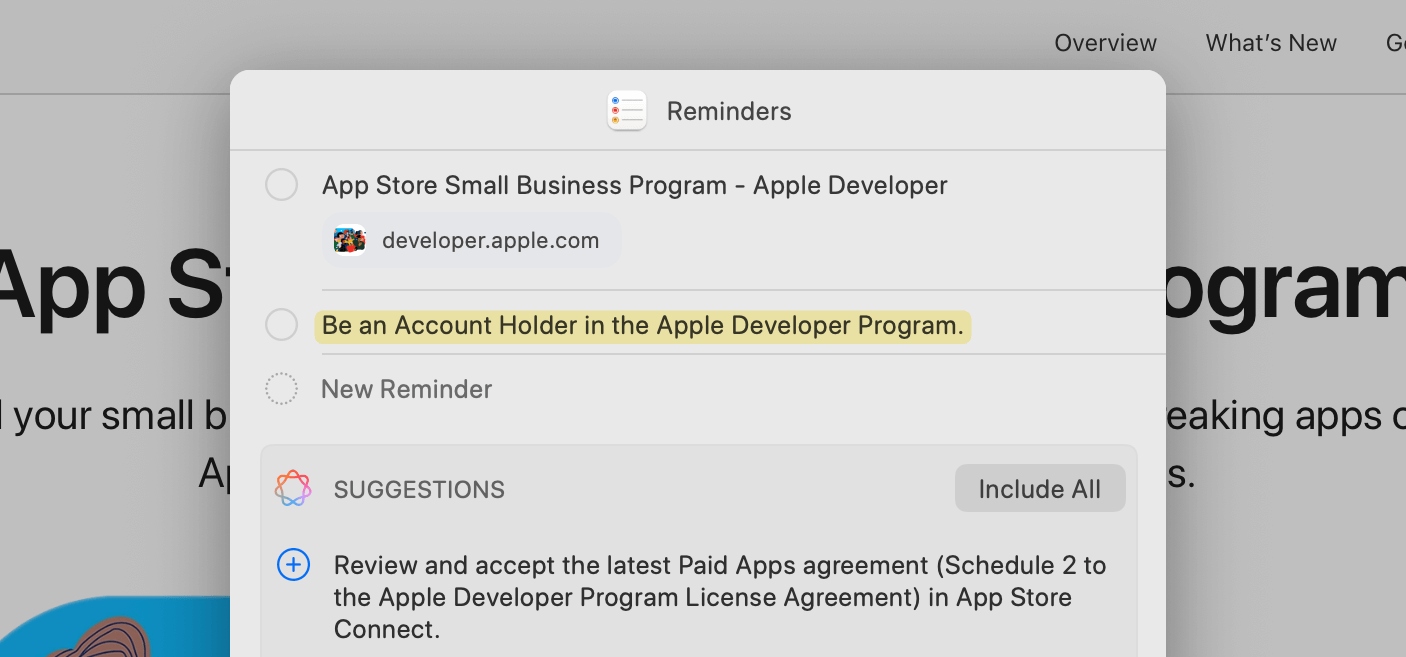 For example, I was reviewing the App Store Small Business program for an app I'm working on, and while trying to save the link for later, Reminders read the page and suggested things I need to do to enrol in the program: