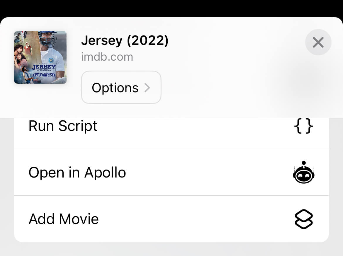 The next time you're browsing the web and need to save a movie to watch, tap on the share button on Safari and scroll to choose your shortcut from the options list: