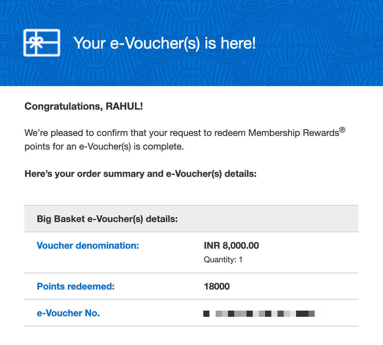 Here's an instance where I redeemed 18,000 reward points for a gift voucher worth ₹8,000 (~$100) for groceries: