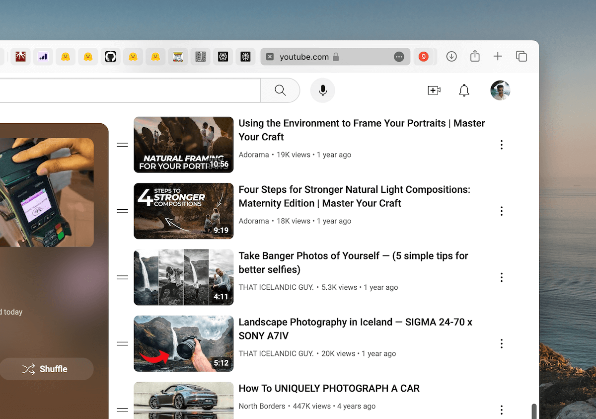 For example, a year or two ago, I was interested in relearning some of the fundamental concepts of photography and picking new tricks along the way. Zooming in on that area of my watchlist reveals a plethora of videos I had saved around camera gear and photography tips: