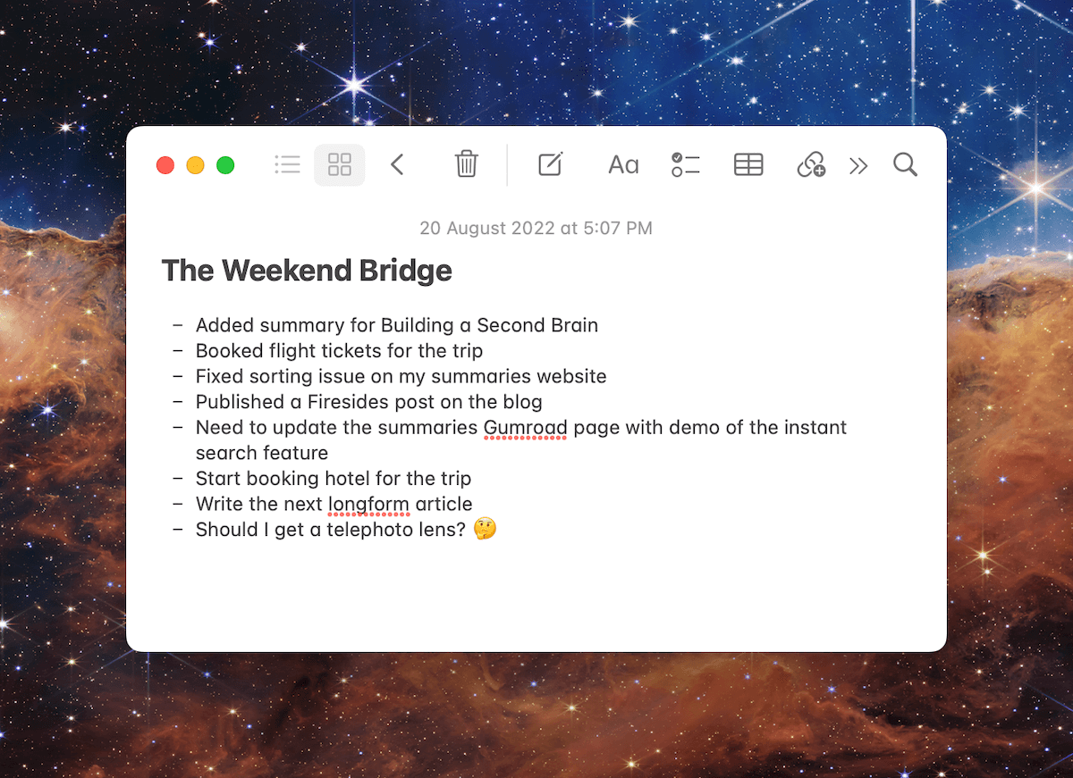 Every Friday or Saturday evening, I launch the Notes app on my computer and jot down the things I did on that day and any pending tasks I need to do on Monday, like this: