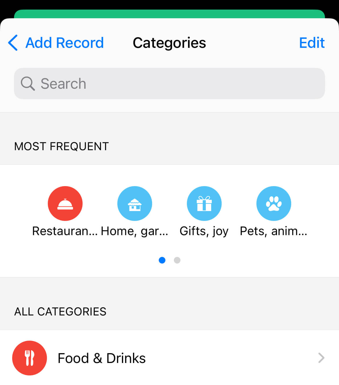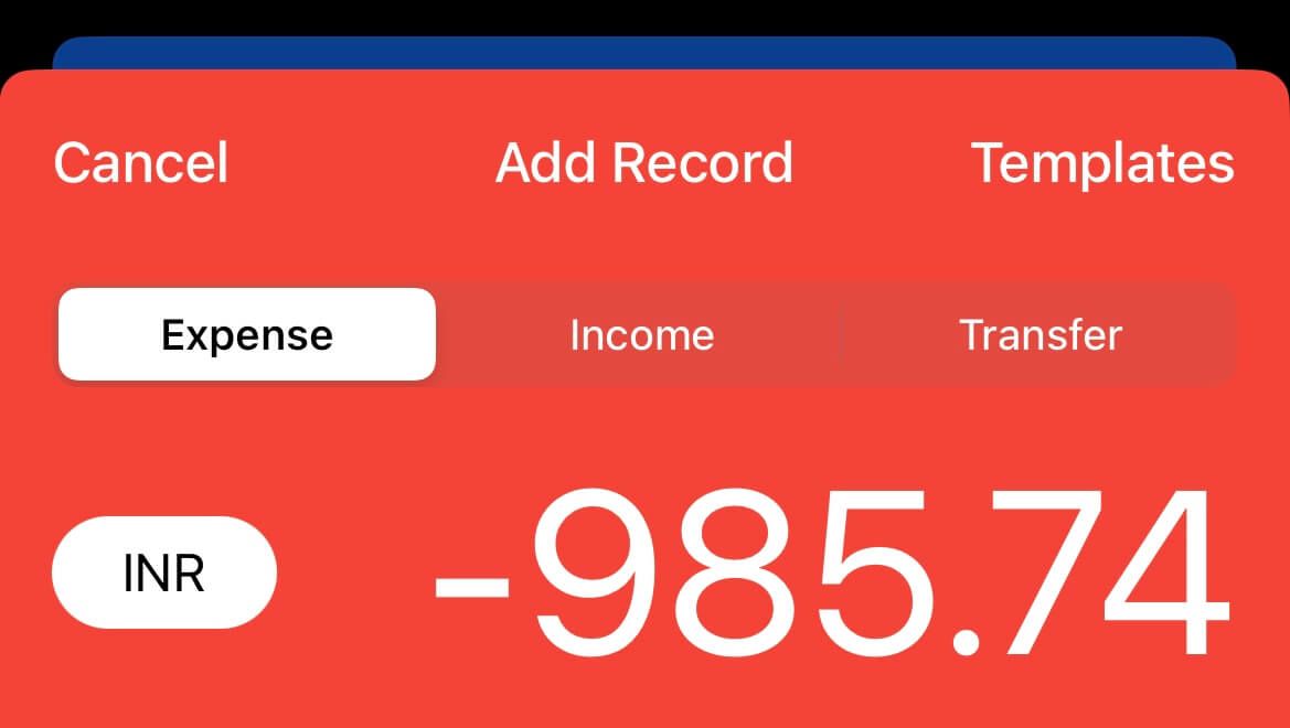 As I open the app to record any expense, I get a quick view of my current bank and credit balances, giving me a rough idea of my remaining safe spending quota for the month.