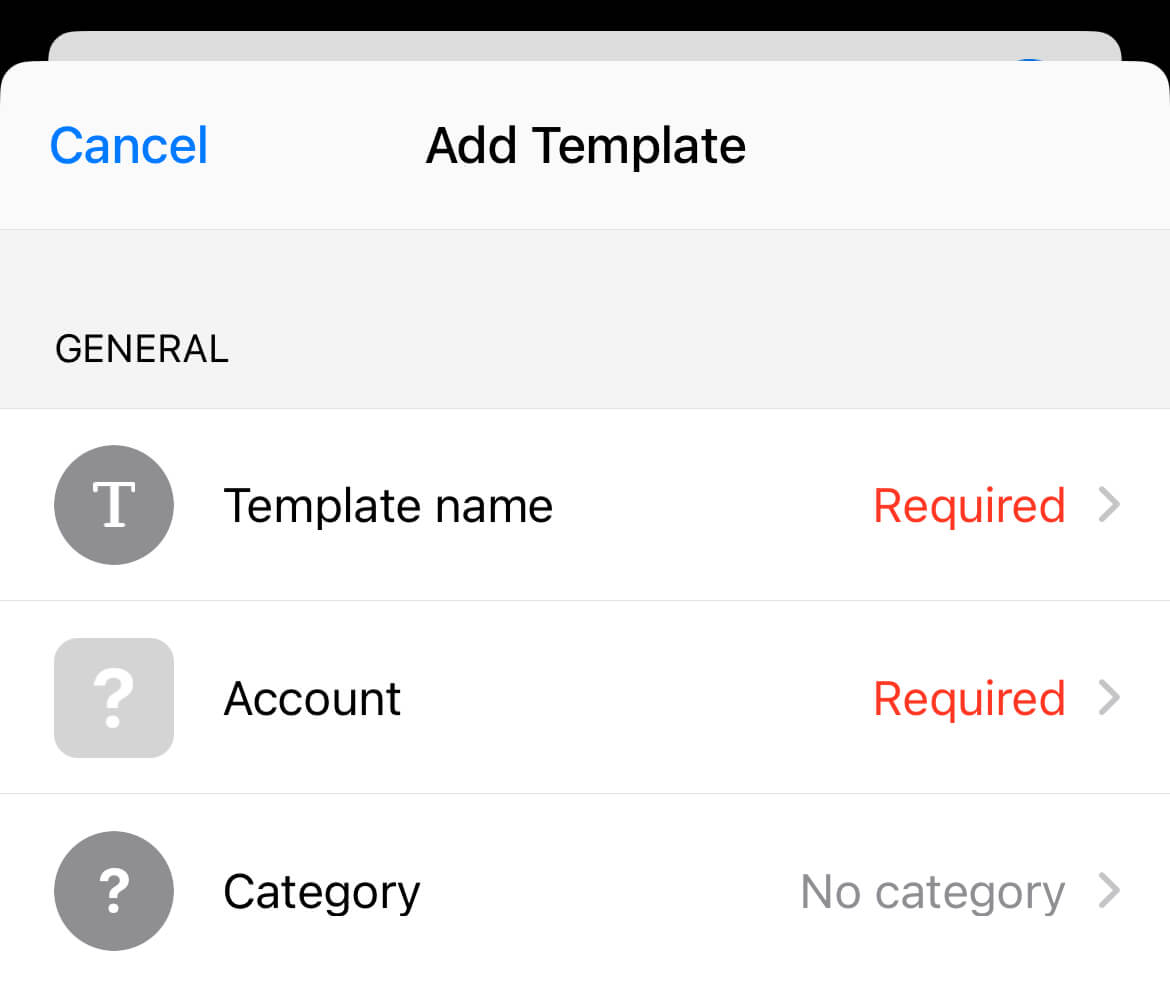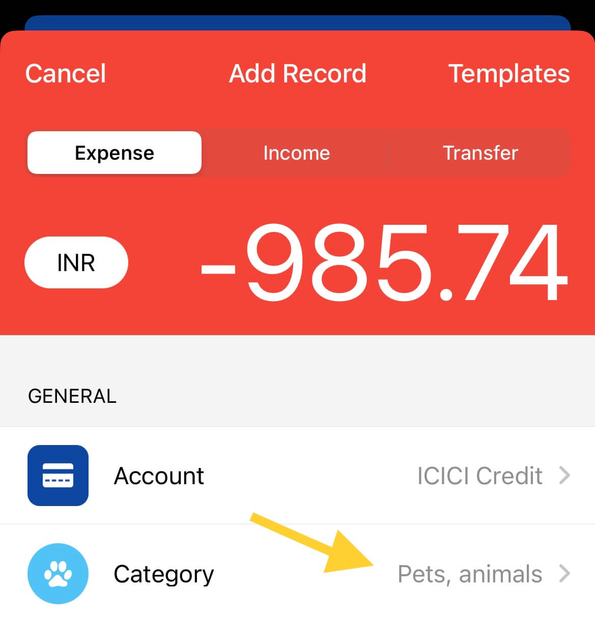 To make recording these transactions less a chore, I've created templates that help me populate the known data like payee name, account and category while adding a transaction in the app.