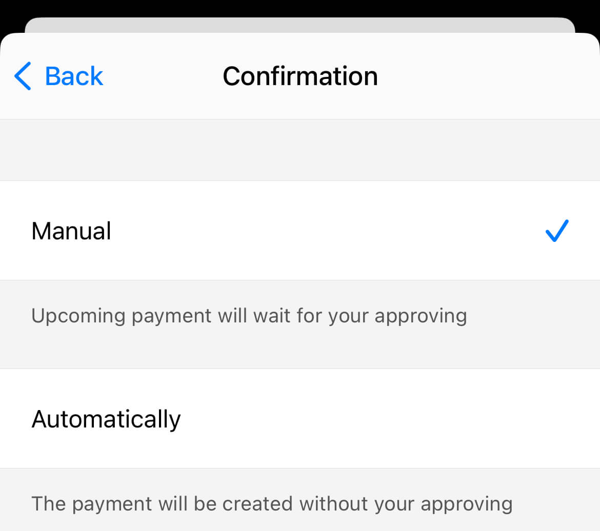 With Manual confirmation, you'll get an approval request before the payment gets recorded into your account, like this: