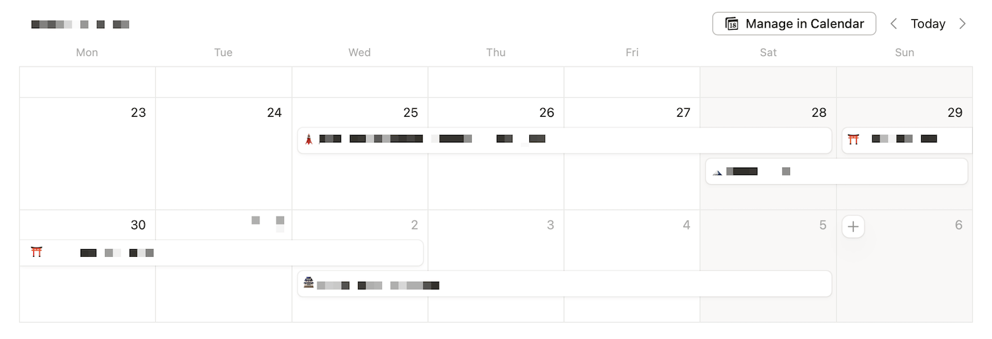 And with Notion's Calendar view, I could see the hotel transitions much more easily than plain-text date ranges: