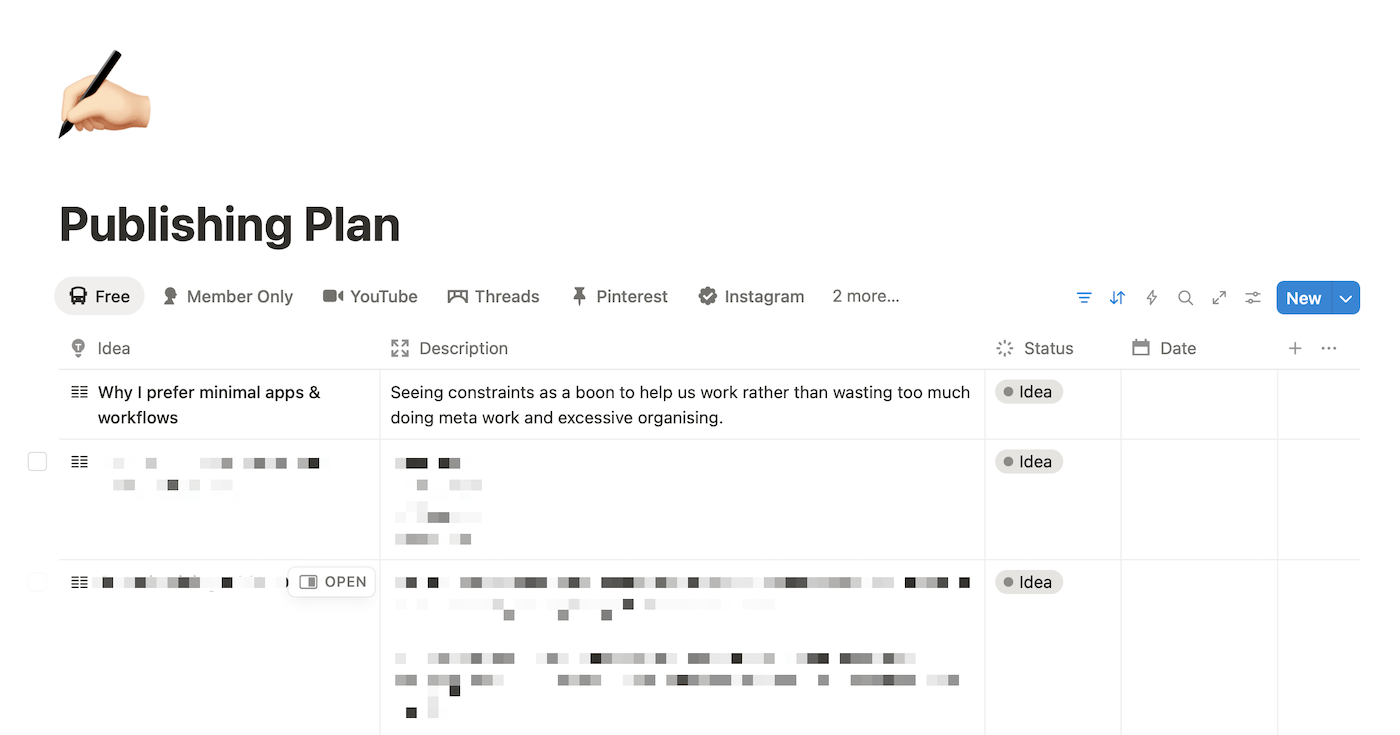 Once an idea has matured into a blog post, newsletter introduction or YouTube video, I rewrite a more polished version of that idea and add it to a Notion database I've created to have an overview of my publishing plan: