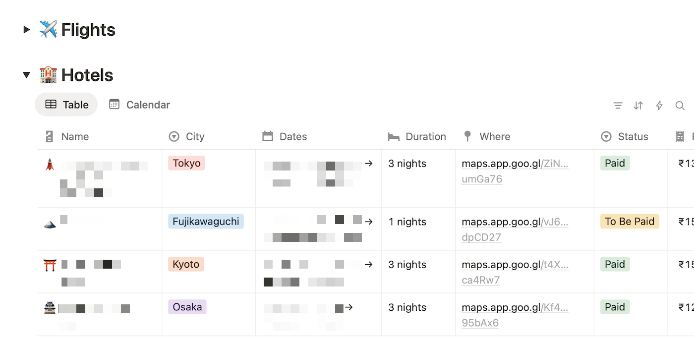 I could have continued planning in the Notes app, but having a structured Notion page to house information on flights, hotels, activities, and the documents required for the visa helped visualise the trip a tad better: