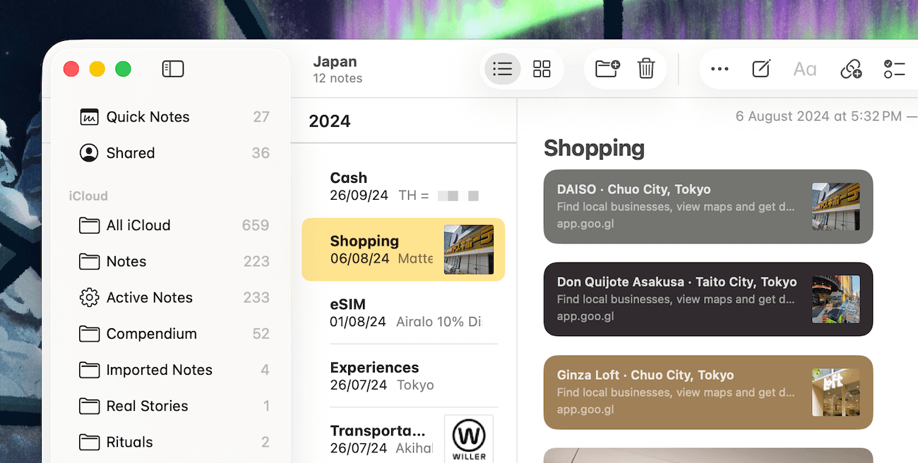 For example, when I was planning a trip to Japan last year, I saved places to visit, eateries to try, guidelines to follow, etc., across various notes in Apple Notes: